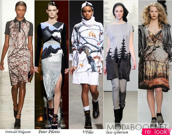 • клетка «Писком сезона» являются красные и черные геометрические сочетания мелких или крупных размеров. Трактовка красной клетки в коллекциях Vivienne Westwood, Marc by Marc Jacobs, Polo Ralph Lauren выглядит довольно дерзко. Черная же, как у Roland Mouret, Steven Alan и Marissa Webb, напротив будет уместна в любом образе. Клетка эффектно смотрится сама по себе, поэтому дополнять комплект стоит однотонными вещами, желательно с повторяющимся цветом принта; • символы массовой культуры Сегодня они являются сутью современного искусства. Примерами вариаций на эту тему могут служить изображения киногероев как у Preen by Thornton Bregazzi, персонажей мультфильмов – Red Valentino, статуи Свободы как у Fausto Puglisi. Самой «хулиганистой» является коллекция Moschino с их яркими платьями, имитирующими обертку от конфет, черно-белый принт а-ля «корова», расцветки в духе Губки Боба. Всем, желающим примерить на себя подобные наряды, стоит остановить выбор на сумке и обуви похожих расцветок. • геометрические фигуры Замкнутые фигуры, ломаные или тонкие линии на одежде – еще один мегапопулярный тренд грядущего холодного сезона. И если декор одежды в виде всевозможных кривых, как в коллекциях Acne Studios, Marc Jacobs, Guy Laroche, Samuji, идеально впишется в гардероб активной творческой женщины, то тонкие линии спокойных расцветок на контрастном фоне сделают подобные наряды уместными даже в деловой атмосфере. Идеями ношения последних щедро делятся с нами Escada, Emporio Armani, Fashion East. • пейзажи в виде макропринта Оно из самых креативных решений сезона, выполненных максимально реалистично, напоминает фотообои. Подобные картины на одежде вы можете найти у Ostwald Helgason, Tracy Reese, Peter Pilotto, V.Files и Tess Giberson. Платья, а именно этот предмет гардероба является носителем природных пейзажей, отличает максимально простой крой и отсутствие декора, чтобы ничто не отвлекало внимание от изображений. Соответственно и аксессуары должны быть подобраны неброские и простые. • цветочные мотивы Тут можно выделить несколько модных течений. Во-первых, изображения роз на черном фоне как у Elie Saab, Honor, Erin Fetherston или творения Dolce & Gabbana на тему павлопосадских платков. Во-вторых, яркие цветочные рисунки на холодном темном фоне, имитирующем сумерки. Подобную красоту из васильковых, голубых, бирюзовых сиреневых бутонов можно наблюдать в коллекциях Clover Canyon, Sonia by Sonia Rykiel, Preen Line, Aganovich, Paul Smith и многих других. Подобные наряды будут как нельзя кстати на прогулке, свидании и даже рабочем месте, если ваш начальник – не сторонник строгого дресс-кода. • расцветки животного мира Бренды Dsquared, Wren, Tom Ford и Celine являются поклонниками классической расцветки под леопарда, что активно и используют в своих коллекциях лаконичных нарядов. Именно в такой дозированной форме, по их мнению, стоит преподносить столь агрессивный рисунок. Марки Acne Studios, Gucci, Zuhair Murad, Vanessa Bruno, Giambattista Vall тоже тяготеют к семейству кошачьих, но трактуют популярные анималистические расцветки несколько по-своему, лишь отдаленно копируя окраски диких кошек. Грядущий холодный сезон обещает быть богатым на броские и неожиданные принты. Рисунок на одежде является прекрасным способом донести до окружающих не только свое текущее настроение, но и характер вкупе с отношением к жизни. Задумайтесь серьезно над тем посылом, который вы адресуете обществу. Поэтому уделите особое внимание поиску близких вам по духу принтам, которые не толь