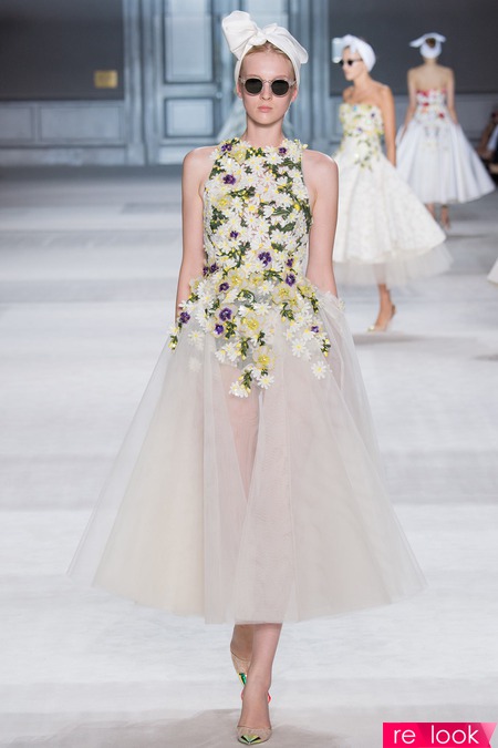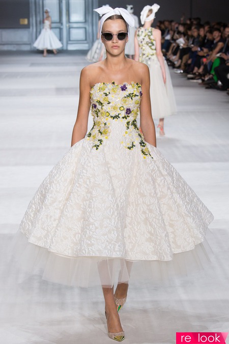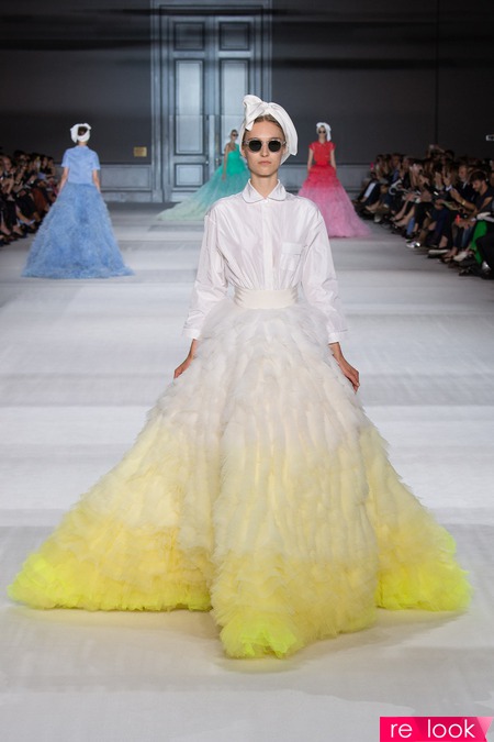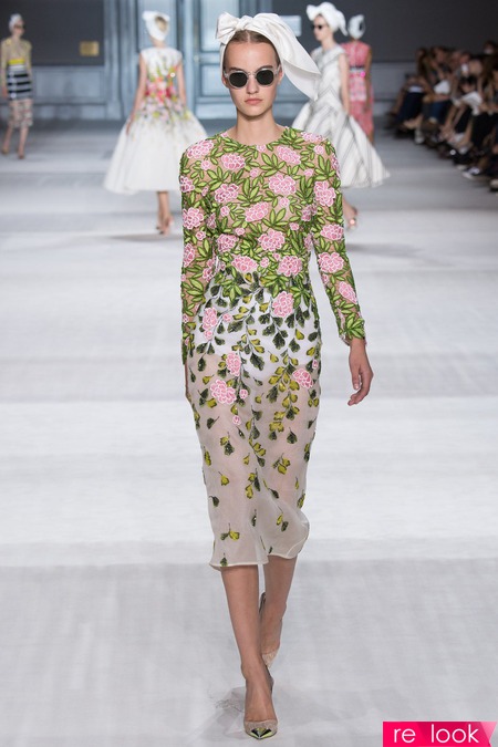 Giambattista Valli, судя по всему, максималистка: если пальто - то из лилового меха, если кейп - то в пол, если платье - то только бальное, или же, в стиле new-look. Флористический принт легко сосуществует с геометрическим, кружевные вставки чередуются с полосками прозрачной ткани, юбки из тюля - со сложно драпированными топами.