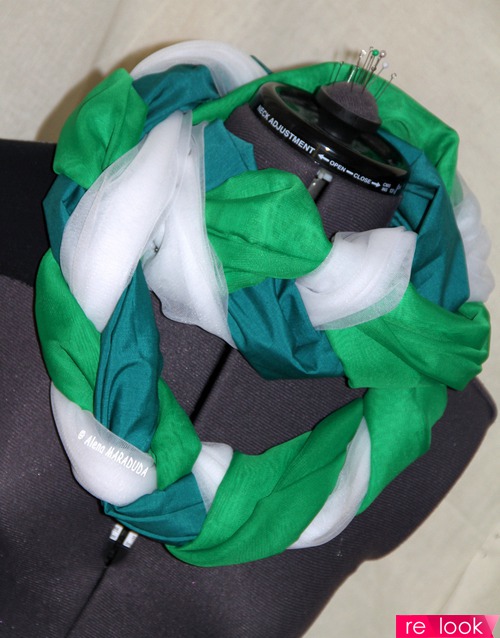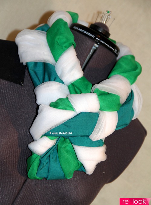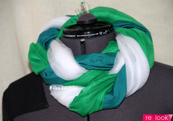 В этой статье я хочу поделиться с Вами полезными авторскими советами на тему аксессуаров в нашем образе. Аксессуары в нашем образе играют огромную роль. Одну и ту же одежду можно подать в таком разнообразном свете, благодаря аксессуарам, делая акцент на определенные детали. В этом случае важно все: выдержать стиль или стилевые смеси - так называемая - эклектика или смешение стилей. Важно обратить внимание на следующие вещи: учитывать простейшие правила композиции в костюме. Правила композиции в костюме Рассмотрим их по порядку. Должен быть выдержан определенный стиль или его смешение- эклектика. Основных стилей четыре: классический, романтический, спортивный и авангардный (экстравагантный) или стиль - фентази. Остальные уже второстепенные: фольклорный, милитари, этнический, сафари, хиппи и т.д. Акцент должен быть на что-то одно - должен быть центр композиции. Он может находиться где угодно, но основной акцент делается на нем. Должны учитываться грамотные пропорции в соответствии с индивидуальными особенностями каждого человека (в зависимости от роста и горизонтальных поясов, то есть соответствие длин и ширин) 1:2, 1:3, золотое сечение и т.д. Золотое сечение – это произвольная величина 1, 618 - в процентном округленном значении - это деление величины на 62 и 38% соответственно (например, 8:5). Должен быть грамотно и индивидуально подобран силуэт костюма, подчеркивающий индивидуальные особенности фигуры: подчеркивать достоинства и скрывать недостатки. Силуэты хорошо перекликаются с буквами алфавита: А, Х, П, Л,Ф, О и т.д. Грамотно выбран покрой рукава (втачной, реглан, цельнокроеный, мягкой формы, фантазийных форм). Одежда должна соответствовать своему назначению. Нужно помнить, что в костюме можно использовать не больше трех цветов. Речь идет о цветах, а не об оттенках, не стоит это путать и забывать. Оттенков может быть гораздо больше, но основных цветов: не больше трех. Пользуемся при этом цветовым кругом. Например, классическое сочетание: черное, красное и белое цвета. Не стоит забывать о семантике цвета. Семантика - это наука о значении цвета. Правильно подобранные аксессуары играют огромнейшее значение в общем образе. Аксессуары могут быть кричащими, то есть акцент, внимание и центр композиции будут на них; могут дополнять общий образ, индивидуально подчеркивая созданный образ; могут быть еле заметными, но быть легким продолжением общего образа. Итак, давайте сначала разберем, что же такое аксессуары вообще. Аксессуар (от фр. accesoire - это принадлежность чего- либо, сопутствующее чему- либо) – второстепенная делать произведения. Главными аксессуарами к одежде могут быть сумки, обувь, головной убор, очки, зонты, перчатки, митенки, нашейное украшение: шарфы, платки, галстуки, бабочки, поясные украшения - пояса, ремни, ювелирные украшения - оплечья, колье, серьги, браслеты, кольца и т.д. Сегодня мы рассмотрим шарфы- платки. Варианты носки шарфов Итак, а сейчас я покажу на индивидуальном примере, что можно сотворить с тремя шарфами- платками. Берем три разные по фактуре платка: сетка - фатин, шелк- шифон, х/б плюс эластан: плотный, бумажный. Три цвета: белый, насыщенный цвет молодой травы и сине- зеленый и начинаем творить. Не забываем учитывать вышеперечисленные правила. Варианты носки: симметричное, ассиметричное, с акцентной частью. Виды носки: оплечье, 