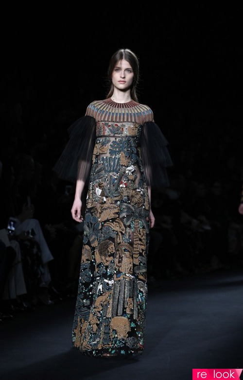 Царство тьмы Осенне-зимний показ от Valentino модные критики практически хором и емко охарактеризовали, как «темно, чувственно и дорого». В этот раз дизайнеры Мария Грация Чиури и Пьерпаоло Пикколи отдали заметное предпочтение темным тонам. В оттенках черного выполнены большинство комплектов коллекции: длинные платья, кожаные плащи, высокие сапоги, короткие юбки, полупрозрачные кофты, изящно вышитые блузки и пр. Брюк, что не редкость для Valentino – одного из самых женственных брендов, не было. Вдохновение из прошлого века Музой для дизайнеров на сей раз стала возлюбленная художника Густава Климта, больше известная как австрийский дизайнер начала ХХ века - Эмилия Луиза Флёге. Ее творения отличались особым характером, подчеркивающим чувственность и независимость женщины. Проблески света Будто споря с загадочной тьмой, постепенно пробирались лучи света в белых тонах. Нередко комплекты представляли собой известную черно-белую классику – белый верх, черный низ. Но встречались и чисто белые наряды, контрастирующие с черной обувью, сумками или небольшими темными деталями в виде полосок на ткани или накидки. Игра в шахматы Валентино любит поиграть в геометрию. На сей раз дизайнеры играли с черно-белыми квадратиками и полосками, комбинируя их в различных вариациях. Благодаря чему, некоторые модели были похожи на шахматных королев из новогоднего маскарада. И от таких смелых и ярких сочетаний порой рябило в глазах. Волнительная история Судя по дефиле от бренда, в моду снова возвращаются всевозможные воланы и рюши, которые смотрятся весьма женственно и воздушно. Где-то «волнительный» акцент сделан только на подоле платья, а где-то им декорирован наряд с верху до низу, что придает силуэту внушительный объем. Этнический раскрас После черно-белых баталий на подиуме появились комплекты, красиво декорированные сложными этническими узорами, которые напоминали североевропейские национальные костюмы. Весьма необычно и гармонично сочетались оттенки бордового, бежевого, синего, желтого и кремового. Платья были украшены при помощи аппликаций из многочисленных кружев, а также вышивки, сложных узоров и перфорации. Сложность отделки тканей от Валентино как всегда удивляет и восхищает. Понравится всем Мария и Пьерпаоло будто пытались угодить сразу всем, представляя комплекты из разных стилей: от классического делового в рамках белой блузы с бантом и черной юбки до смелого геометрического или сложно-этнического. Дизайнеры бренда поддержали неуверенно блеснувший в прошлом году тренд мешковатый свитер с прозрачной юбкой. Не обошлось и без традиционных цветов на тюле и сочно красного платья – дань уважения мэтру Валентино Гаровани. Алый наряд был подобен обнаженному сердцу показа, мотив которого публика помнит с прошлых показов. А что сверху? Поскольку показ демонстрирует одежду для предстоящих холодных сезонов, то без верхней одежды обойтись было нельзя. Она представлена длинными, приталенными кожаными плащами, полушубками, куртками из кожи, пальто и накидками из овечьего и лисьего меха. И крестьянка, и дворянка Платья с этническим орнаментом эффектно контрастировали с нарядами, украшенными королевскими розами и сложнейшей вышивки на дорогих тканях в духе средневековой знати. Но если флористическое направление вполне привычно для бренда,