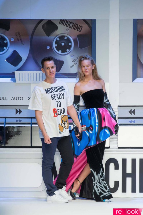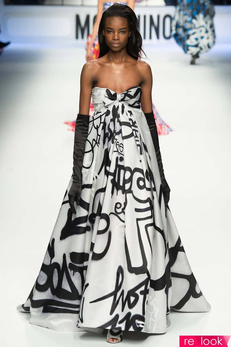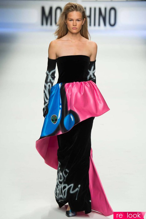 Moschino - это яркие пуховики, дутые и стёганые комбинезоны, лучшие традиции r&b культуры - бейсболки, искусственный мех, массивные золотые украшения. Деним (кстати, интересные решения у юбок - они либо "перешиты" из рубашек, или же как бы надеты "вверх тормашками". И, конечно, принты - Looney Tunes, мишки и граффити - причём, на вечерних платьях.