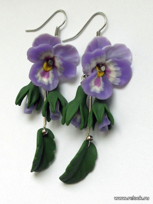 Нежные цветы - анютины глазки, выполнены из полимерной глины. Колье длиной 44 см и серьги -длина до последнего листика 7 см.