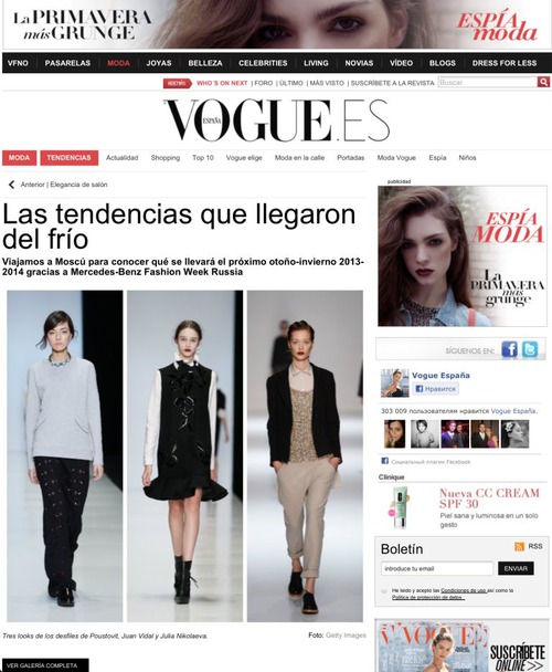 Карла Сиерра, редактор моды Vogue Espana, приехала в Москву узнать, что готовит Осень-Зима/2013-2014 на Неделе моды Mercedes-Benz Fashion Week Russia, и вынесла свои предположения о том, что предложат русские дизайнеры трендсеттерам всего мира через полгода. Немало внимания Vogue.es уделил показу испанца Хуана Видаля.